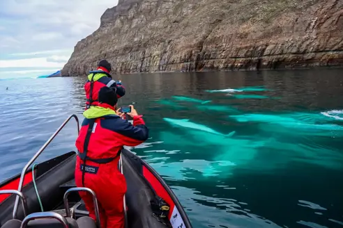 Fra maj til juli er fuglelivet i fjorden i top – vi passerer levende fuglefjelde som Diabasodden og Fuglefjellet, hvor tusindvis af fugle holder til. Og med lidt held dukker der også hvaler op – især hvidhvaler ses ofte i området.
