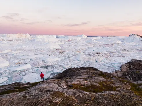 Oplev naturens rå kræfter på en spektakulær flyvning over de enorme isfjelde. Vi lander ved Sermeq Kujalleq, en af verdens mest aktive gletsjere. Her får I 30 minutter på fastlandet til at indsuge den unikke atmosfære og nyde panoramaudsigten over den enorme ismasse.