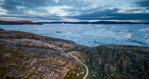 Oplev naturens rå kræfter på en spektakulær flyvning over de enorme isfjelde. Vi lander ved Sermeq Kujalleq, en af verdens mest aktive gletsjere. Her får I 30 minutter på fastlandet til at indsuge den unikke atmosfære og nyde panoramaudsigten over den enorme ismasse.