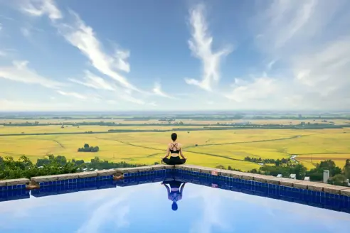 Glæd dig til et unikt og idyllisk hotel med udsigt over de frodige rismarker, der markerer området, og det flade, frodige Mekong-delta, og hver bungalow er udstyret med moderne faciliteter og en privat terrasse, hvor du kan nyde den rolige, afslappende atmosfære, der ligger over hele hotellet og bjergsideområdet.